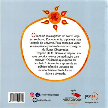 O menino mais agitado do bairro viaja em sonho ao Planetamente, o planeta mais agitado do universo. Para conseguir voltar a sua casa ele precisa desvendar o enigma do Super Observador. Rogerio De M. Barros se inspirou em seus prórpios alunos de meditação para escrever "O menino que queria ser bombeiro". A aventura apresenta ao público infantil o universo do autoconhecimento de forma lúdica e divertida.
